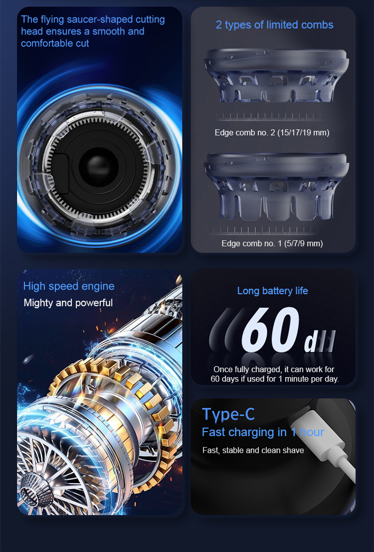 German precision blades, sharp and smooth, no hair jamming, no scalp damage. IPX6 waterproof certified, fully washable. 7000 RPM quiet motor, Type-C fast charging, long battery life, up to 60 days of use. Support 7-day free returns, free shipping, 10-year warranty, full refund for any quality problems!